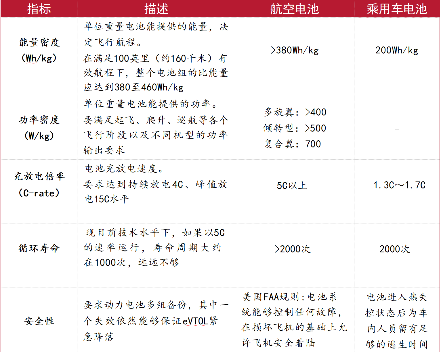 表 3:航空级电池与乘用车电池性能指标要求对比