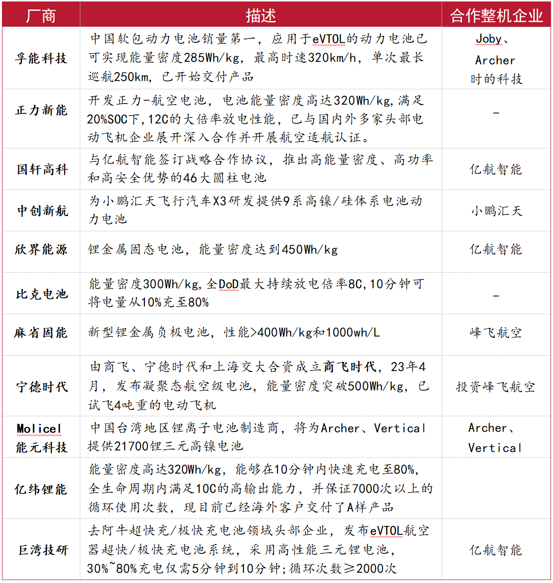 表 4:eVTOL 电池开发进展