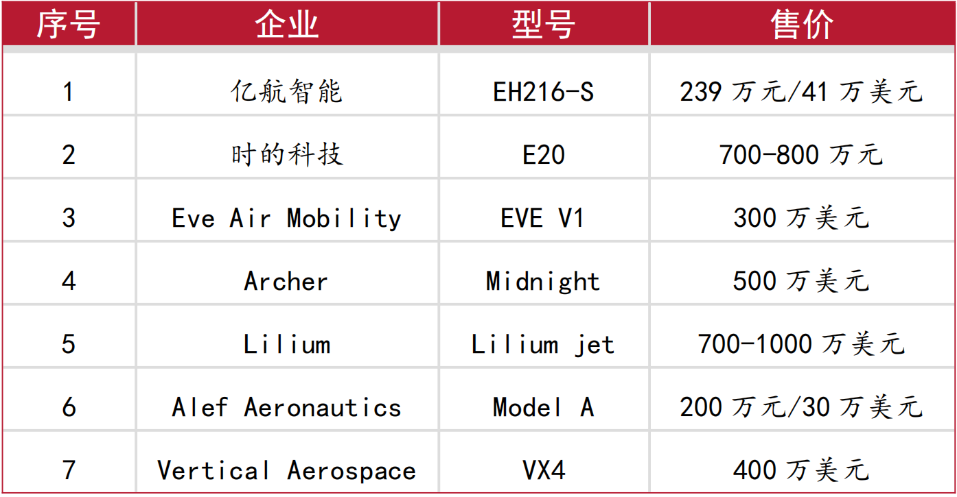 表 5:在售eVTOL 机型签约销售价格