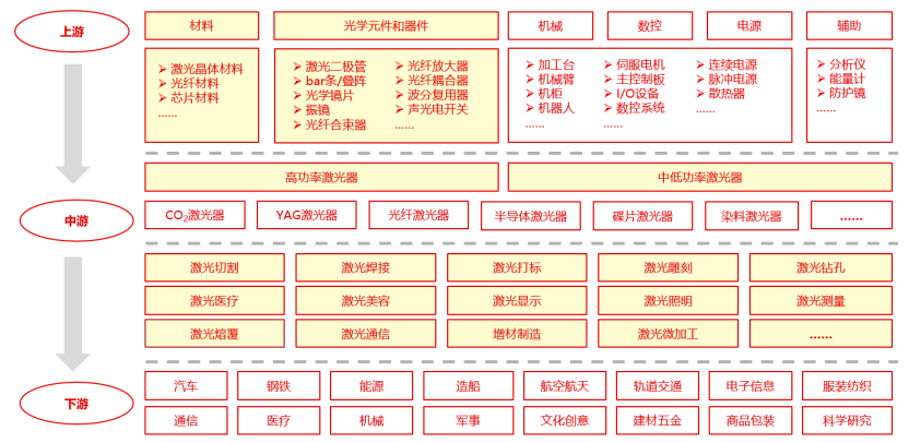 中游:中游厂商将上游激光芯片及各种光学元器件进行组装制造出激光器,包括光纤/半导体/固体/CO2气体激光器等;