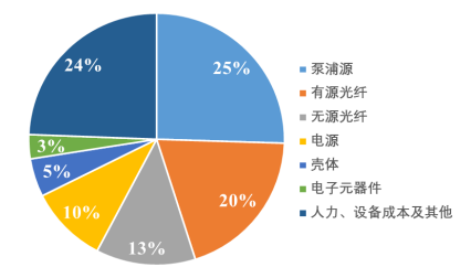 上游光学材料及元器件占激光器成本高,且技术壁垒高,是激光器制造的基石。以光纤激光器为例,其材料成本占总成本近80%,光学类材料占比约60%(泵浦源25.5%、有源光纤19.6%、无源光纤12.6%)。