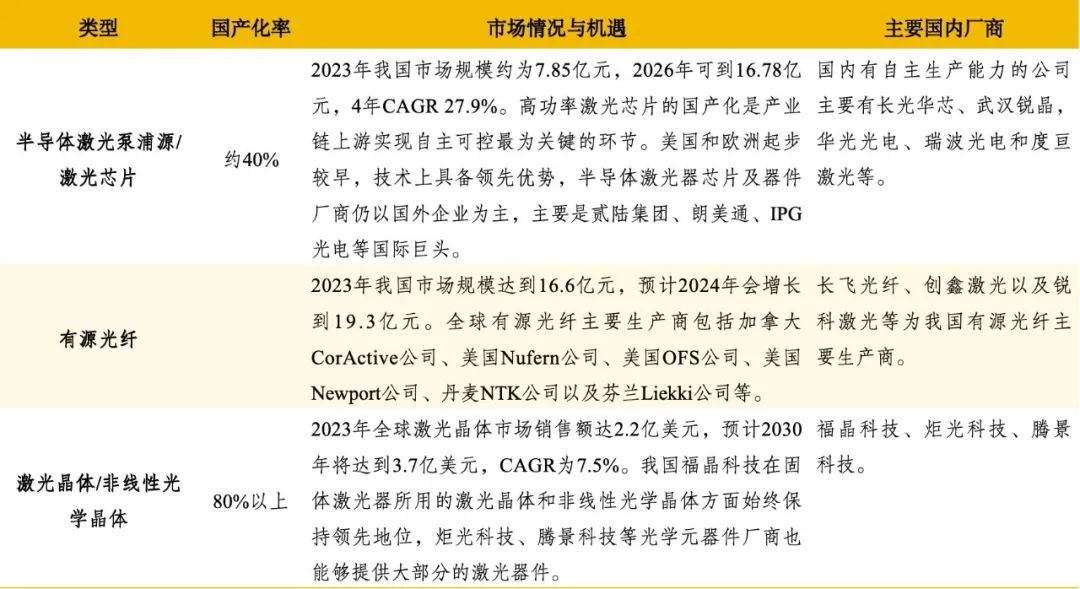我国已实现激光器所需光学材料及元器件的自主生产,但高功率半导体激光芯片、有源光纤等高端零部件仍部分依赖进口。