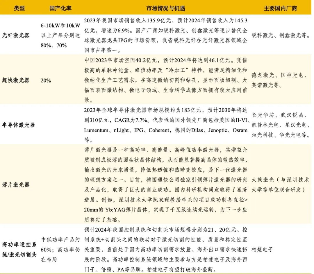 我国企业集中于下游设备端(通用设备技术成熟),而高端光学元器件、激光器、运控系统和激光加工头等领域参与者较少。