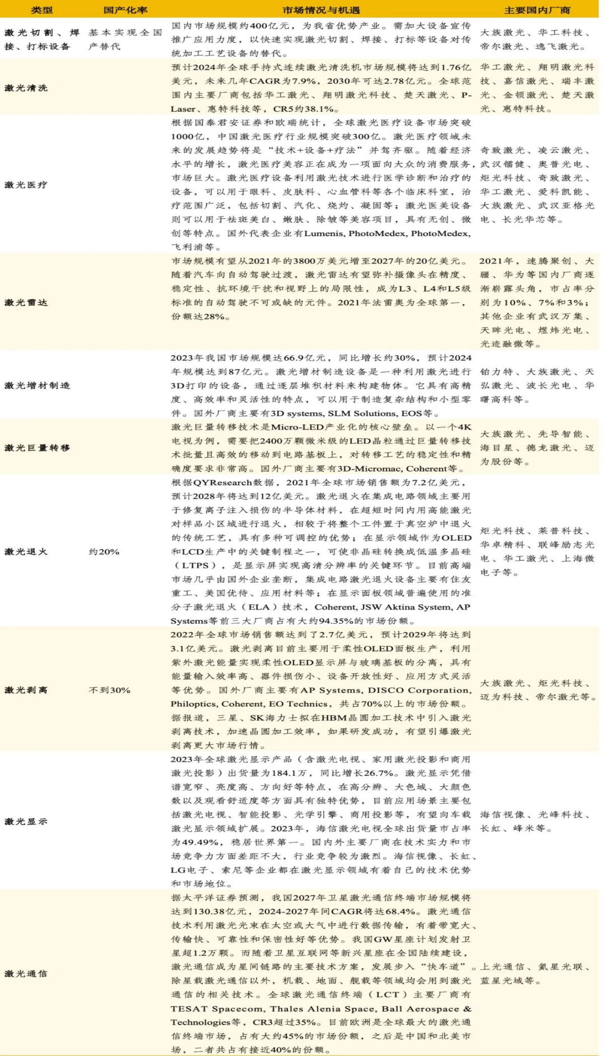 2023年我国激光设备市场规模910亿元(同比+5.6%),2024年预计达965亿元(同比+6%)。切割、焊接、打标为三大核心应用(占比约40%),新兴领域如新能源汽车、半导体、光伏等需求快速增长。