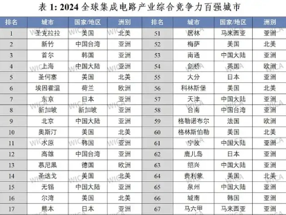WICA最新发布的《2024年全球集成电路产业综合竞争力百强城市白皮书》中,一个重大变动引发行业震动:上海首次超越美国圣何塞(硅谷),跃居全球第四位,成为首个跻身全球集成电路产业第一梯队的中国大陆城市。