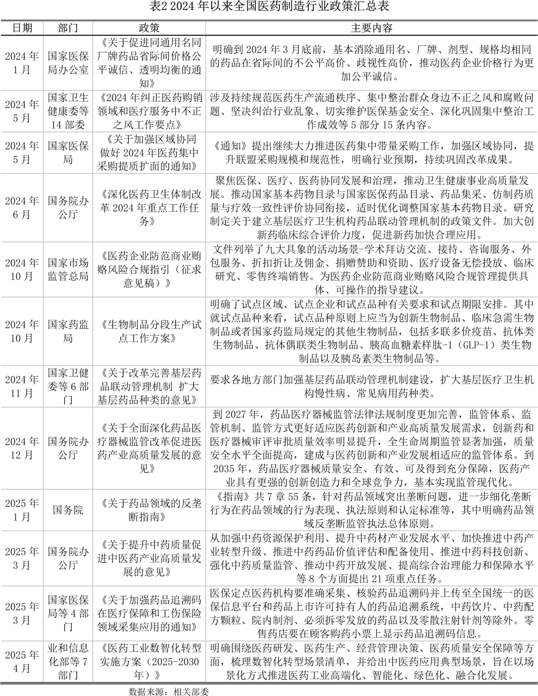 医药行业是密切关系国计民生、经济发展和国家安全的战略性产业,也是国家大力推动和重点支持的新质生产力范畴。受政策支持、人口老龄化等主要因素影响,我国医药行业预计仍将持续增长;据相关报告预测,预计到2030年我国医药行业市场规模将达到2.89万亿元,中国市场预计占全球市场的1/6,且增速或略高于全球市场规模增速。当前,医药行业面临严峻复杂的国内外环境,行业增速持续放缓,但整体仍保持一定韧性。预计2025年,在集采的覆盖范围和落地预期管理愈加充分,且院内秩序整顿趋于稳定情况下,诊疗活动和药品器械使用正在逐步恢复,院外消费医疗经营节奏日渐稳定,医药需求将不断扩大。此外随着我国新药审评审批的提速,我国创新药产品将加速落地。2025年,我国医药制造行业整体增速有望修复。