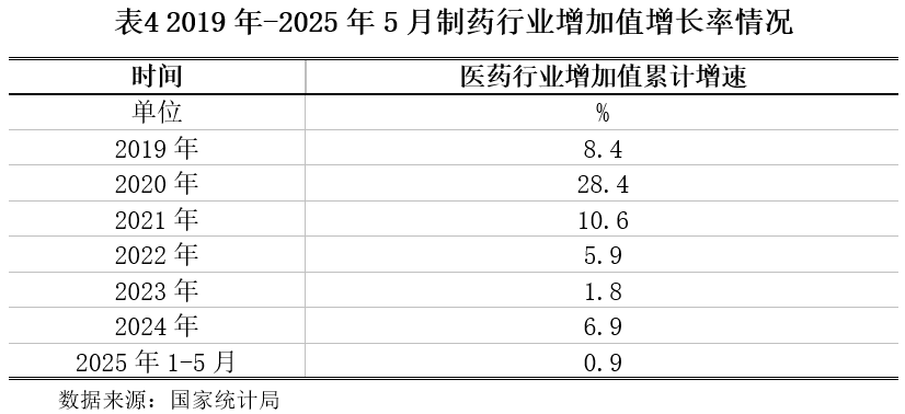 当前,国家持续强化医药产业战略定位,通过创新药优先审评、医保目录动态调整、带量采购等一系列政策举措,稳定企业生产预期。人口老龄化加速以及慢性病发病率上升,推动刚性用药需求的持续扩大。基层医疗市场呈现出显著的扩容态势,同时国际医药市场需求结构性复苏,内外需市场共振为医药产业发展提供有力支撑。在以上因素的共同作用下,2024年我国医药制造业工业增加值实现正增长。全年累计同比增长3.6%,增速较2023年提高9.4个百分点。2025年1-5月,医药制造业规模以上工业增加值同比增长0.9%。