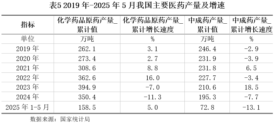 目前,我国大宗原料药供给端产能充足且较为集中,随着专利到期药物数量的持续增长,我国特色原料药产能逐步释放。特色原料药企业在制剂一体化战略下扩大自用原料生产,带动吡啶类、沙坦类等高端中间体产量提升。大宗原料药企业在完成环保改造后产能逐步释放,特别是抗生素中间体等品种的供给恢复性增长。2025年1-5月,化学药品原药累计产量为158.5万吨,同比增长5.0%。