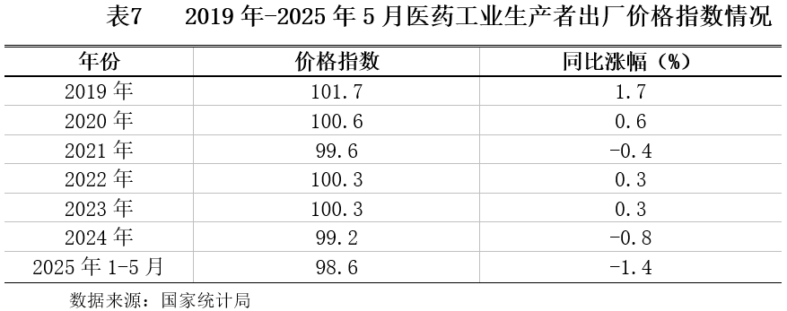 近年来,我国医药行业价格体系受到多方面因素的综合影响。带量采购的常态化推进以及医保谈判力度的加大,使得化学药品制剂和中成药等品种的价格降幅进一步扩大。国家和地方联盟的集中采购不断提速并扩大覆盖范围,导致中标药品和医疗器械的价格出现不同程度的下降。此外,“四同药品”的医保药价治理以及市场竞争的加剧,也促使药品企业主动降价。2025年以来,全国医药制造业工业生产者出厂价格下降。国家统计局数据显示,2025年1-5月,我国医药工业生产者出厂价格指数为98.6,同比下滑1.4%。