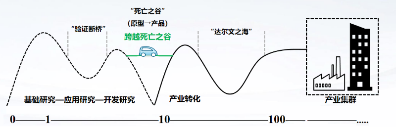 科技创新是一个由基础研究、技术应用、成果转化、产业化等各环节紧密衔接的过程。这一过程往往会面临三道难关:一是创新概念向原型机演进的“验证断桥”;二是原型机向产品演进的“死亡之谷”;三是产品向大规模量产演进的“达尔文之海”。概念验证是推动创新概念和早期科技成果迈向市场化、产业化应用早期阶段的关键驱动环节,是畅通科技成果转移转化的“最初一公里”;从技术研发到产业化落地的资金短缺鸿沟被称为“死亡之谷”。产研院致力于科技成果转化,通过概念验证和拨投结合项目实施,帮助创新创业团队跨越验证“断桥”和“死亡之谷”,打通科技成果转化的“最初一公里”和“死亡之谷”;以股权直投和基金投资的方式撬动多元化社会资本,发挥基金赋能增效作用,跨越科技成果产业化过程中的“达尔文之海”。
