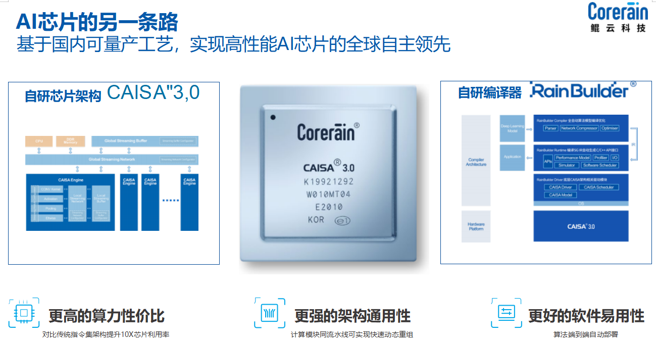 鲲云科技是全球领先的人工智能算力和解决方案供应商,以开创性可重构数据流AI 芯片技术为核心,构建算力、算法、平台三大关键服务能力,自研AI 芯片 CAISA,突破了内存墙瓶颈及制程工艺逐步放缓的制约,实现芯片利用率和实测性能指标的数量级提升,芯片利用率最高达 95.4%。为智慧城市、智慧能源、智能制造等领域提供好用易用的AI算力服务和行业解决方案,是国家高新技术和专精特新“小巨人”企业,获得中国智能科学技术最高奖、世界人工智能大会最高奖、“中国芯”优秀技术创新产品奖、工信部--《先进计算典型应用案例》。业务覆盖中国大陆、东亚、东南亚和中东等地区。公司研发人员占比60%,拥有2个研发中心,5个联合实验室,并与Intel、浪潮、Dell、飞腾、国家城安院等达成战略合作,以科技自主创新为核心驱动力,提供下一代计算平台,加速人工智能落地。